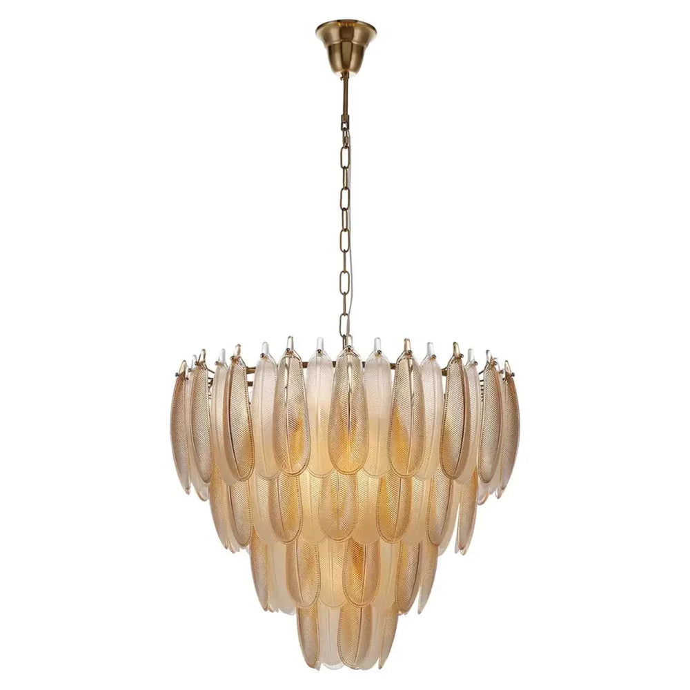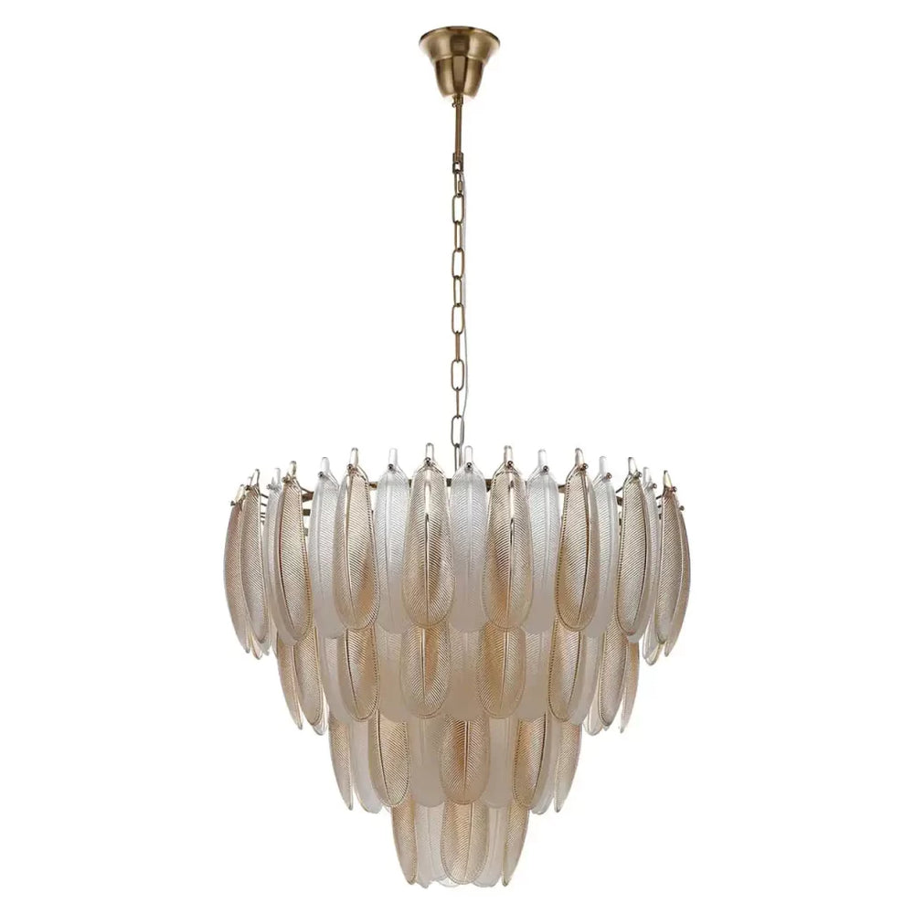 Hanging from a sleek metal chain, this stunning chandelier boasts four overlapping tiers of textured glass droplets, so beautifully alternating between clear and champagne gold hues. The shape and texture of these long, rounded droplets are reminiscent of delicate feathers, adding a layer of opulence and sophistication to your space.