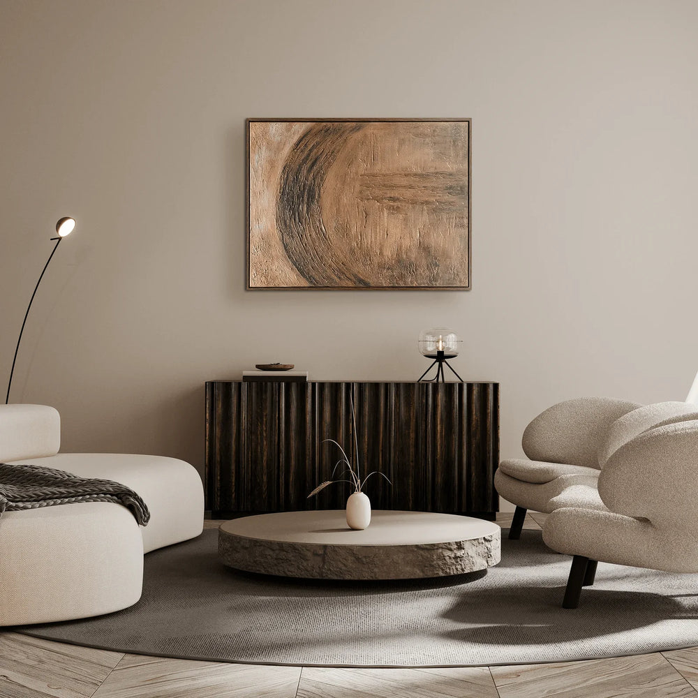 A mysterious quality sits within this art piece. The sombre colour palette and celtic markings of Draiocht art creates an ethereal composition with a sense of motion and depth. The dark wood frame finish keeps the intricacy of the piece contained. Draiocht, is a hand-painted design, by artist Jess Kelly.