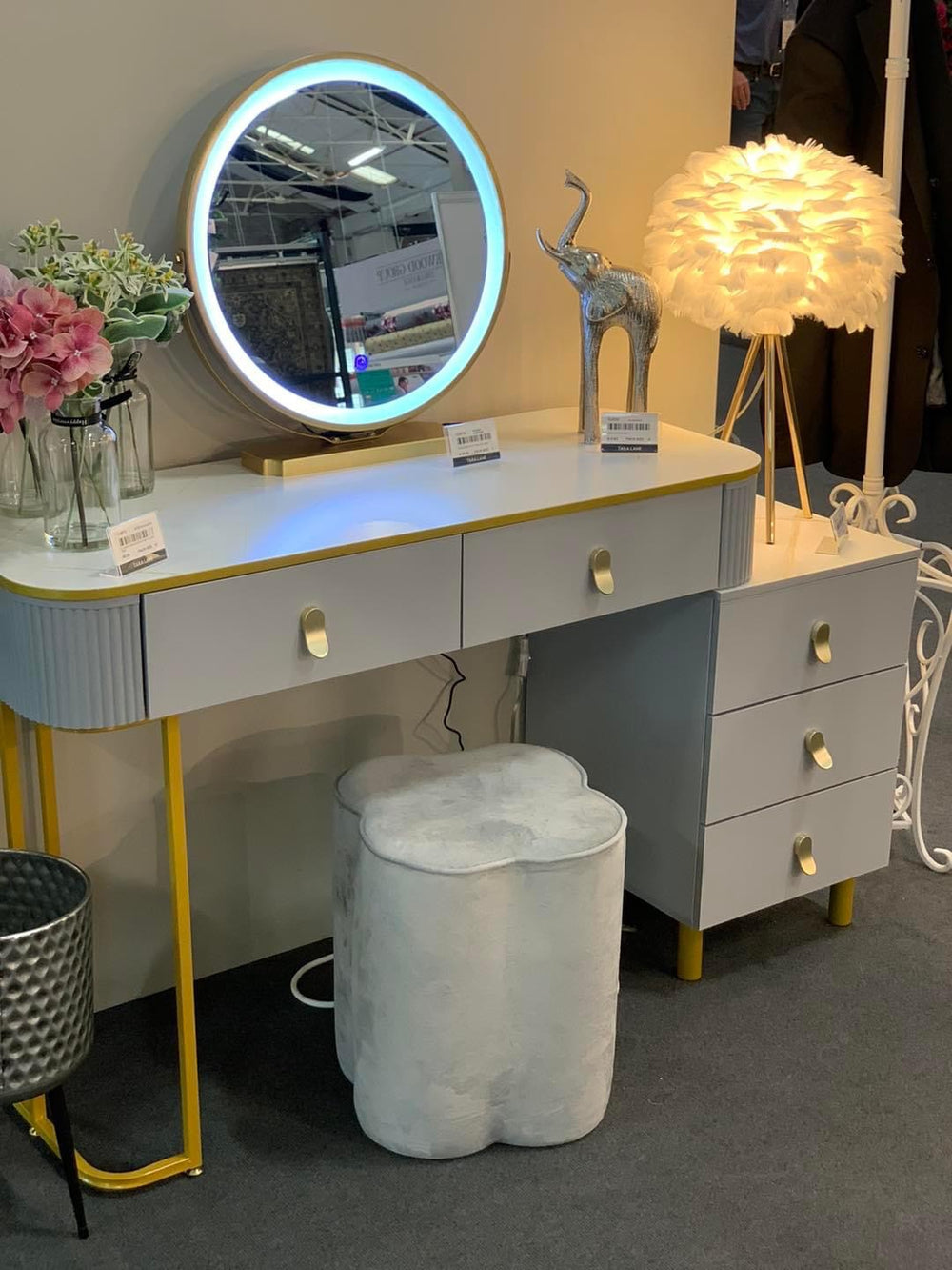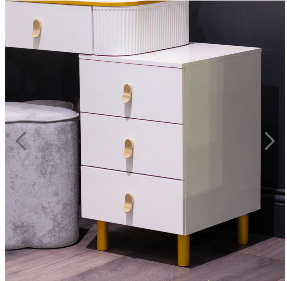 This set includes a table with a built-in LED mirror, an attached chest of drawers, and a stool.