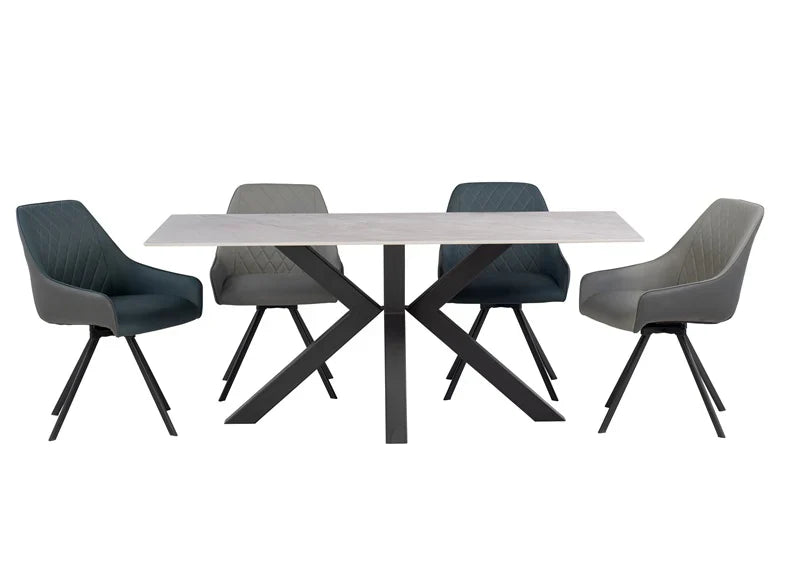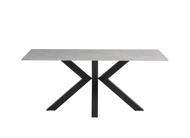 The Karen Dining Table features a x-shape metal frame with a sintered stone effect mottled top in Kass gold or Rebecca grey , a particularly well made table for everyday use that can only add a sense of stylish luxury to a dining room.