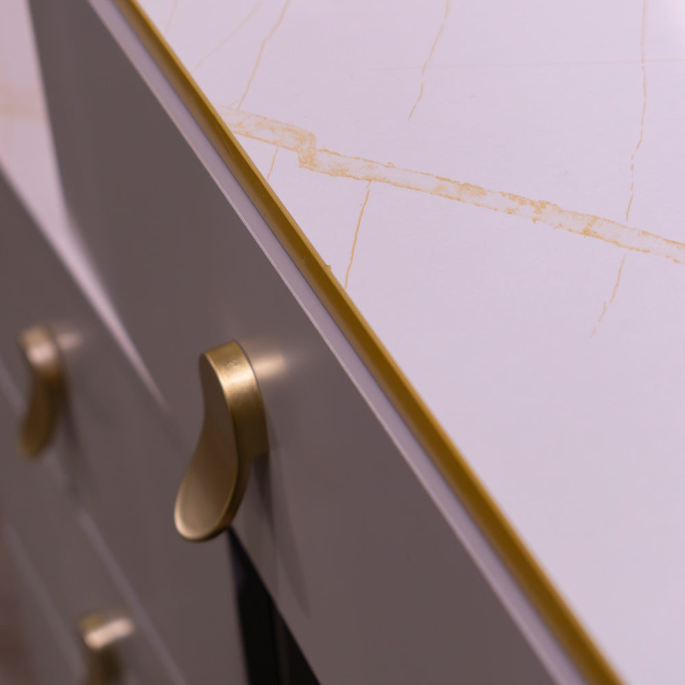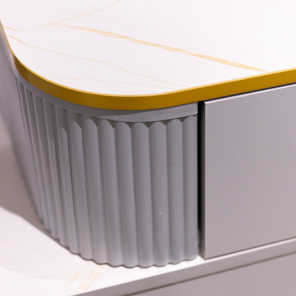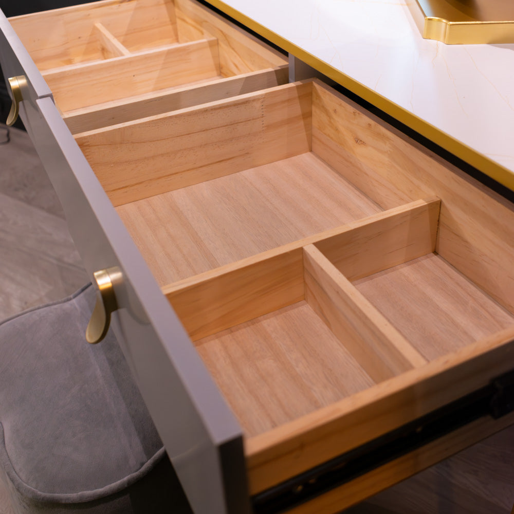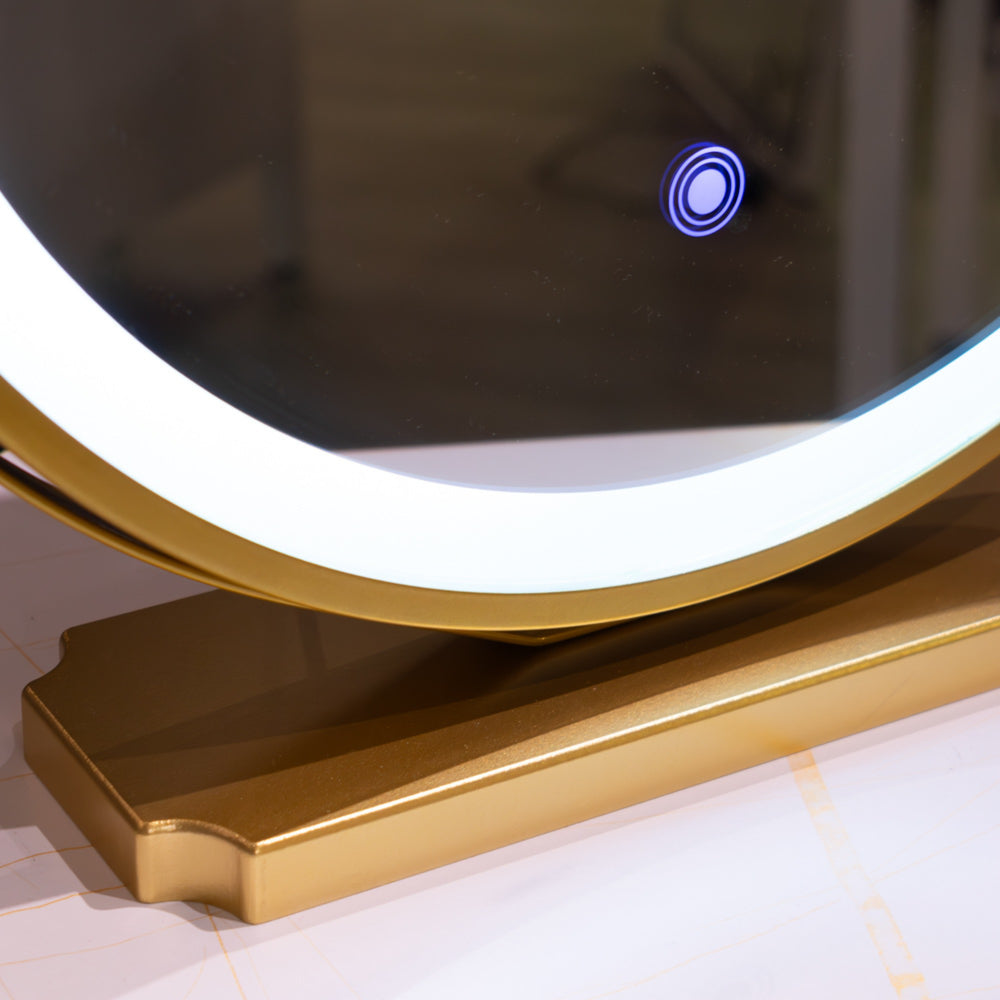 This set includes a table with a built-in LED mirror, an attached chest of drawers, and a stool.