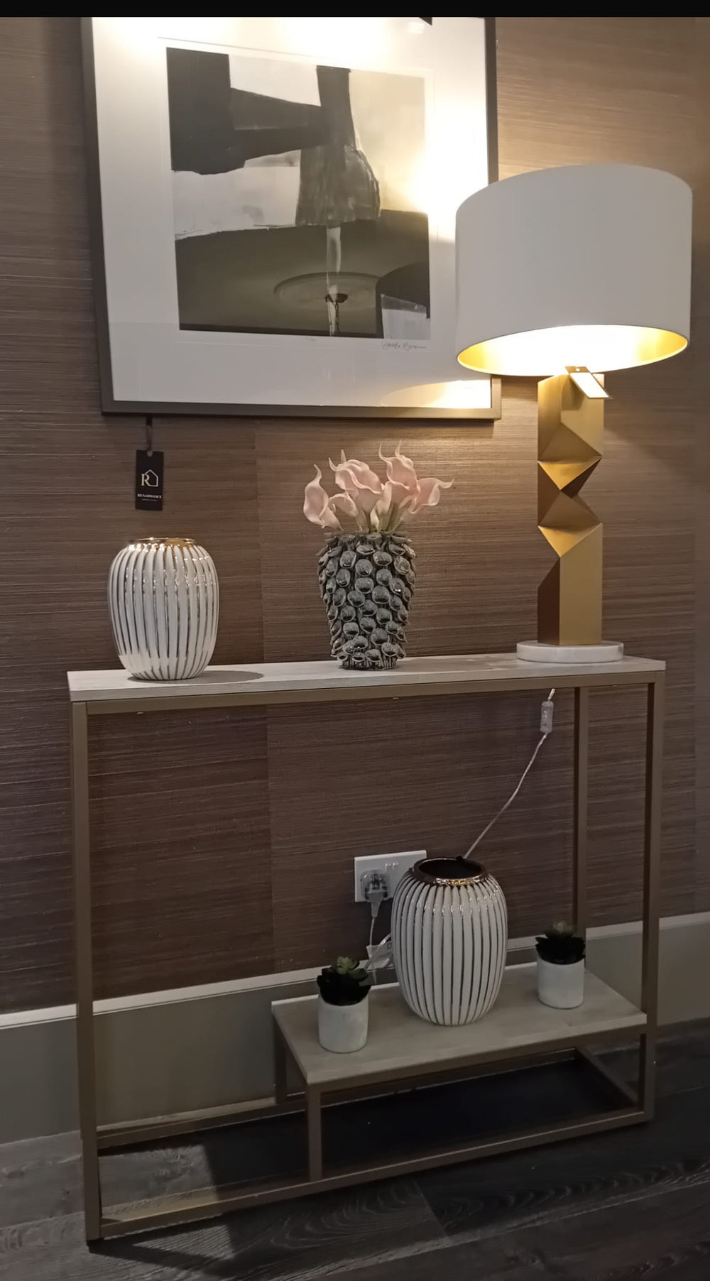 The Susanne Gold and Cream console table is cleverly designed for narrow hallways or alcoves or smaller spaces. Consisting of a Gold metal frame with tiered Cream wooden, faux concrete finish top and smaller lower shelf, this piece will provide ample display space.