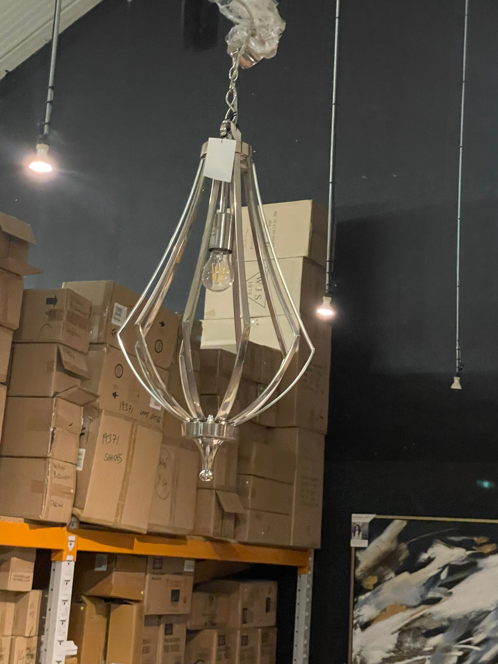 Beautiful teardrop shaped ceiling pendant with a highly polished nickel plated frame made of stainless steel. Comes with a 1m chain and nickel plated ceiling rose.
