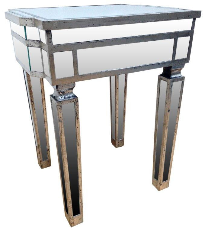 End /side table with an antiqued vintage style wooden edging , bevelled mirror top and bevelled mirror panels