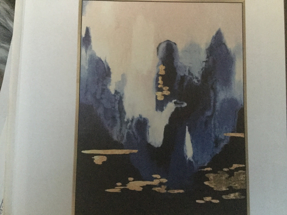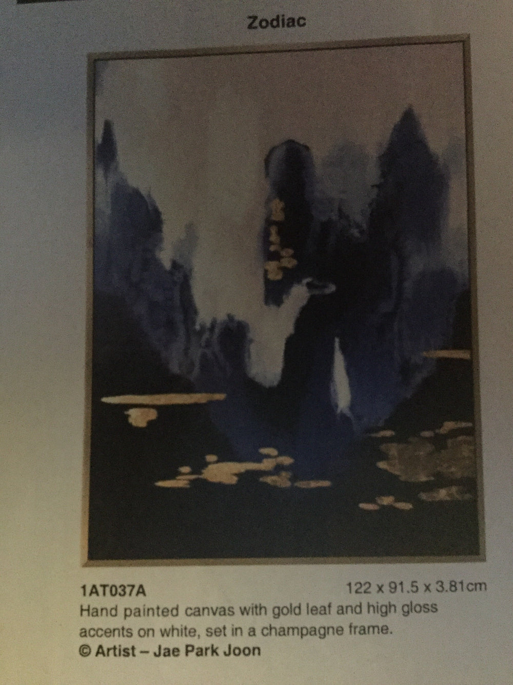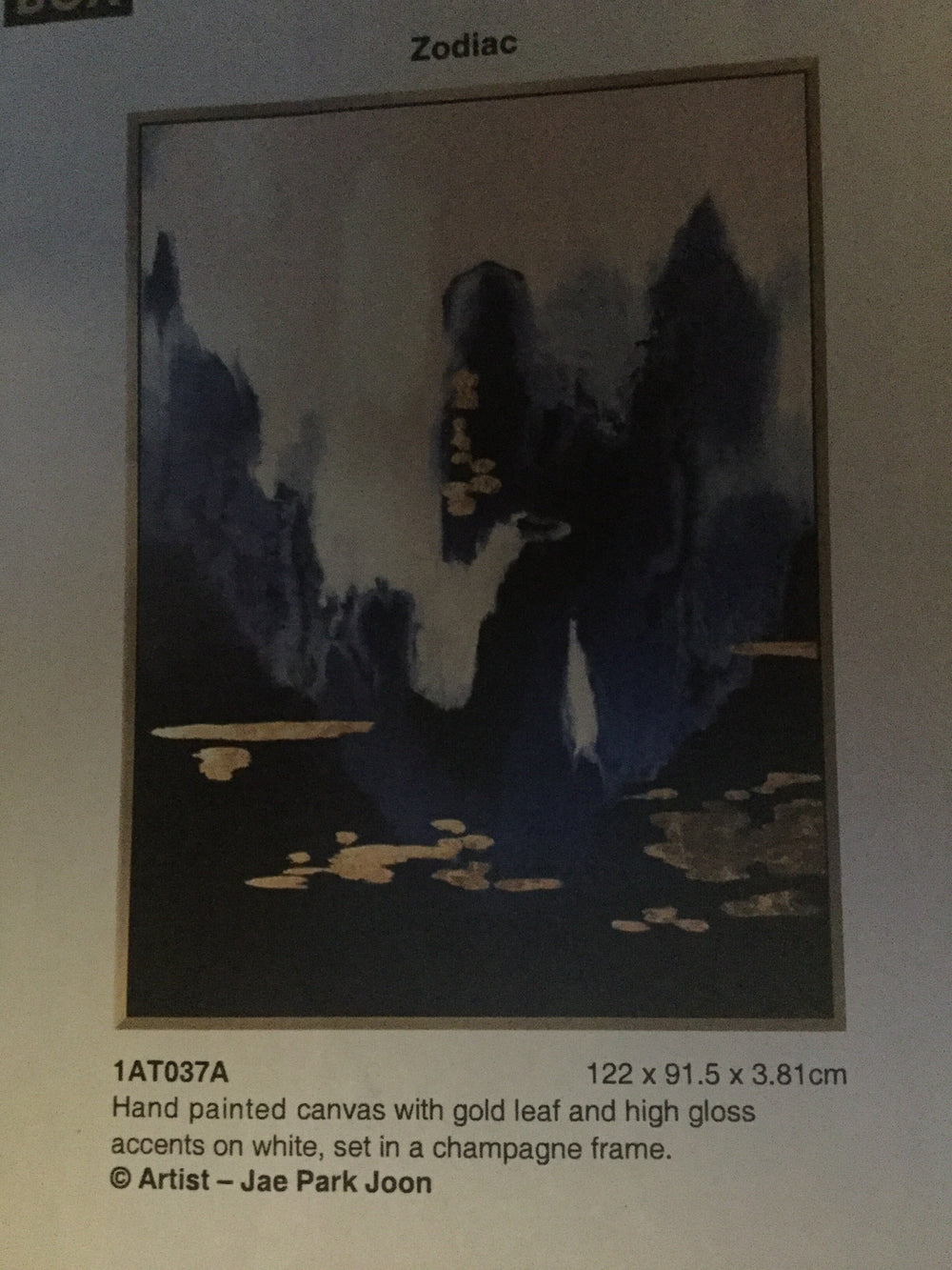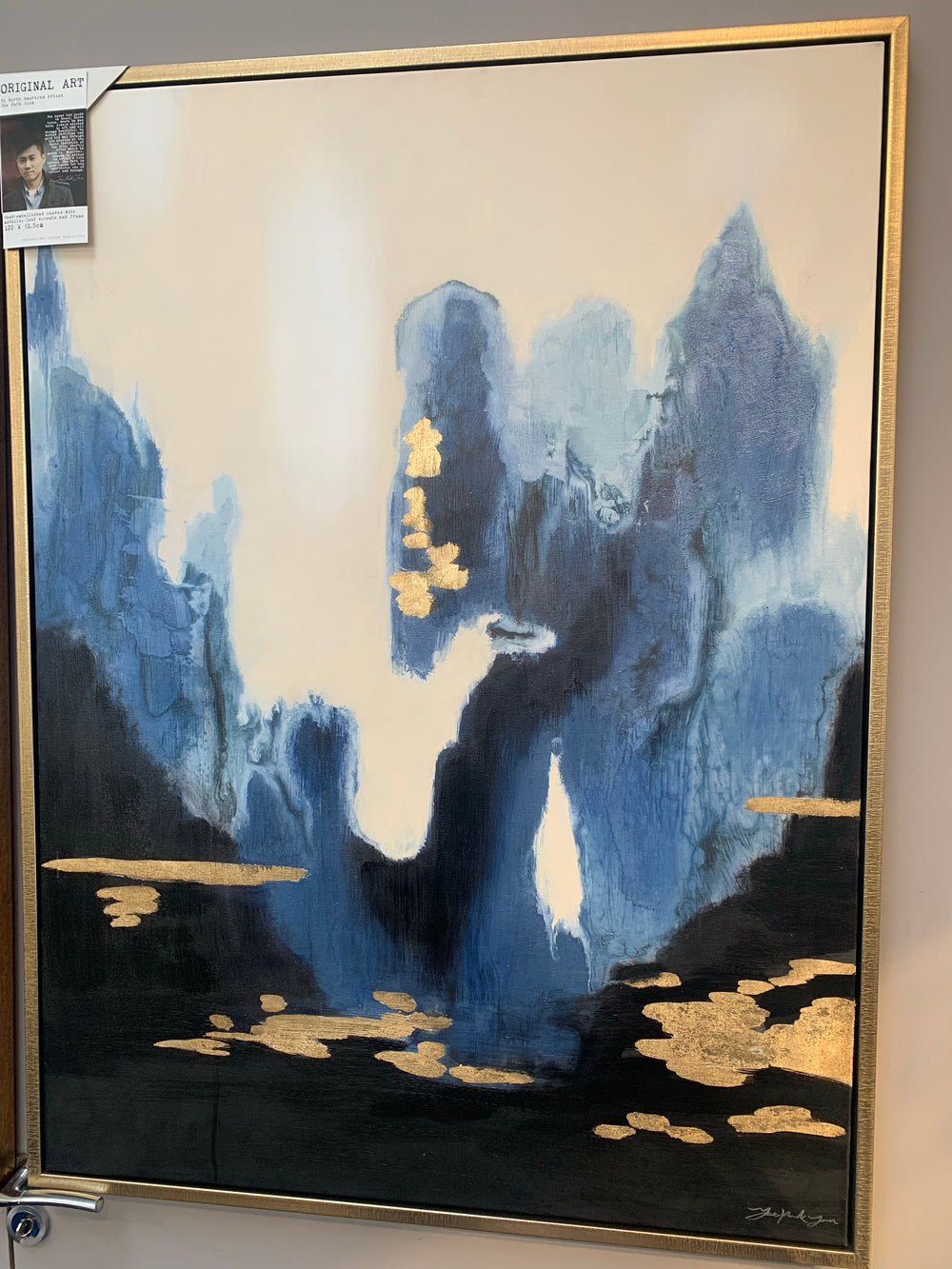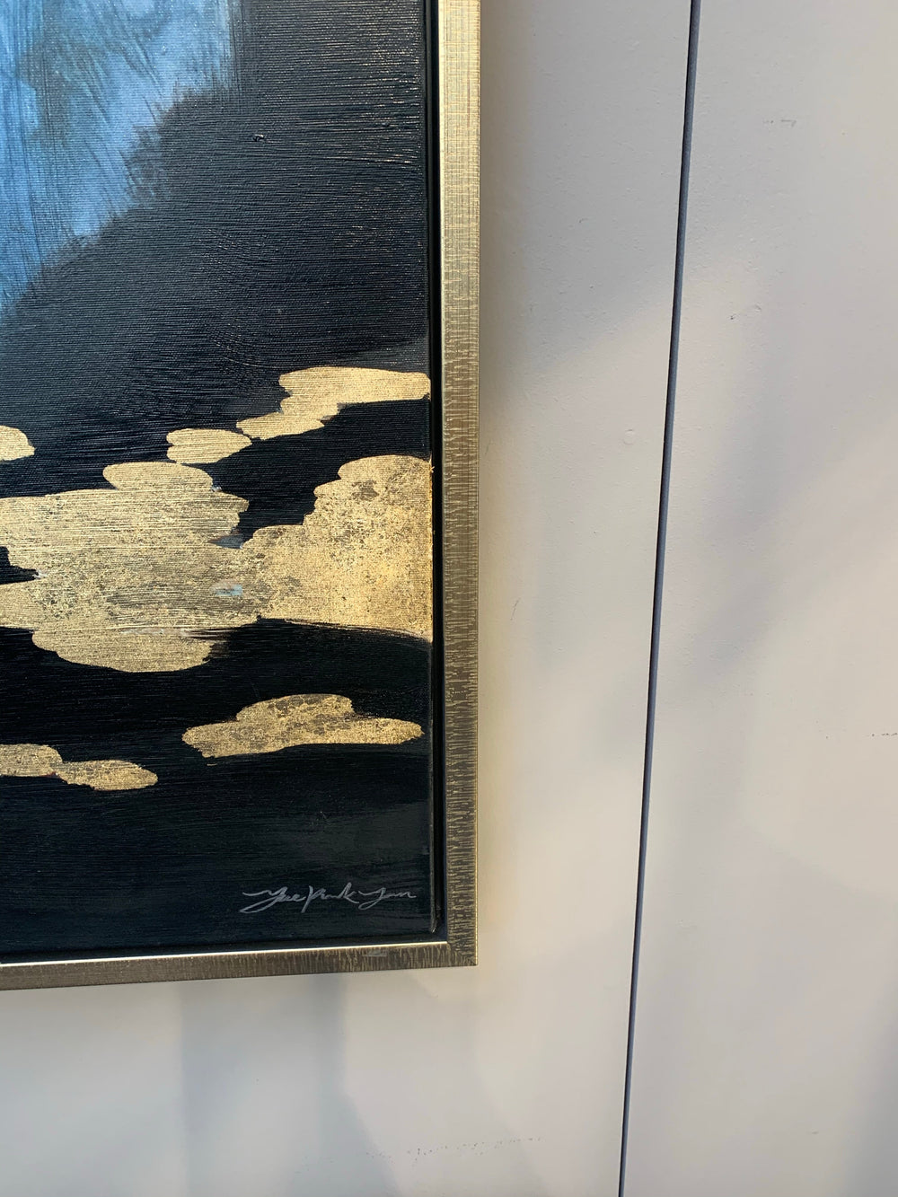 Zodiac, Multi is a modern original abstract painting. This piece features bold hues of blue and navy with gold leaf accents, finished inside a gold frame. Zodiac is a hand-painted design, by artist Jae Park Joon.